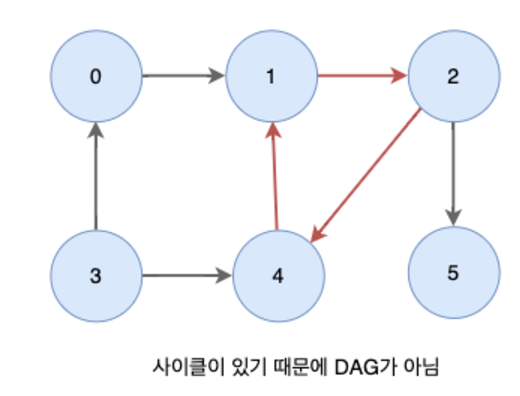 사이클은 노드 사이에 선수관계를 알 수 없는 그래프를 의미한다. 사이클이 있는 방향 그래프에서는 어느 노드가 선순위에 있는지 알 수 없기 때문에 위상정렬이 불가능하다.