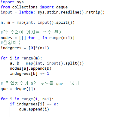 각 노드가 가지는 진입차수를 순차적으로 없애야 한다. 처음에 진입차수가 0인 노드를 que에 집어넣는다.
