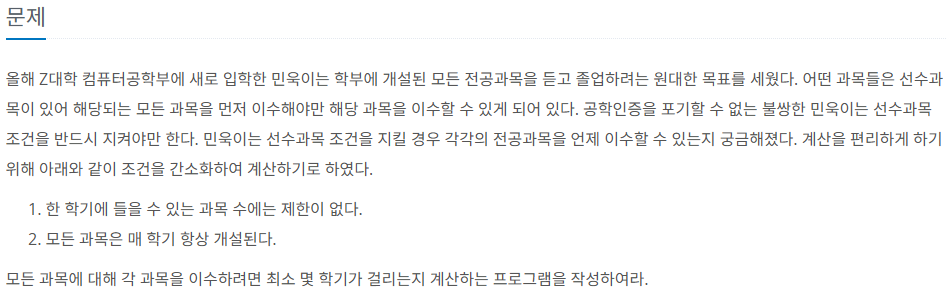 모든 과목을 이수하는 데 걸리는 학기 수를 구하기 위해서 과목의 선수 관계를 파악해야 한다.