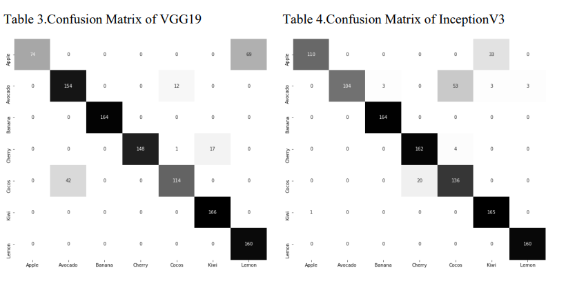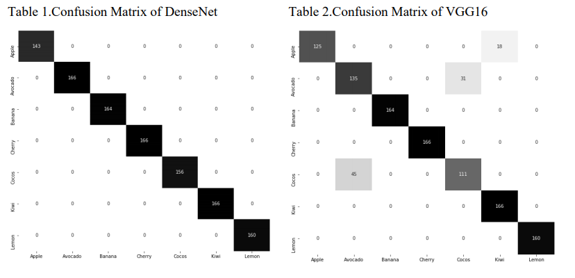 분류기의 성능은 143개의 아보카도, 166개의 바나나, 164개의 체리, 166개의 코코넛, 156개의 키위, 166개의 망고, 160개의 오렌지로 구성된 1121개의 이미지로 분석됨.