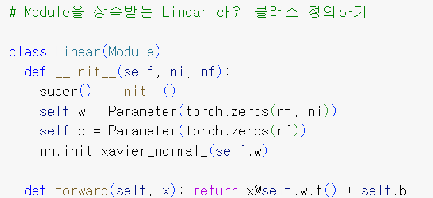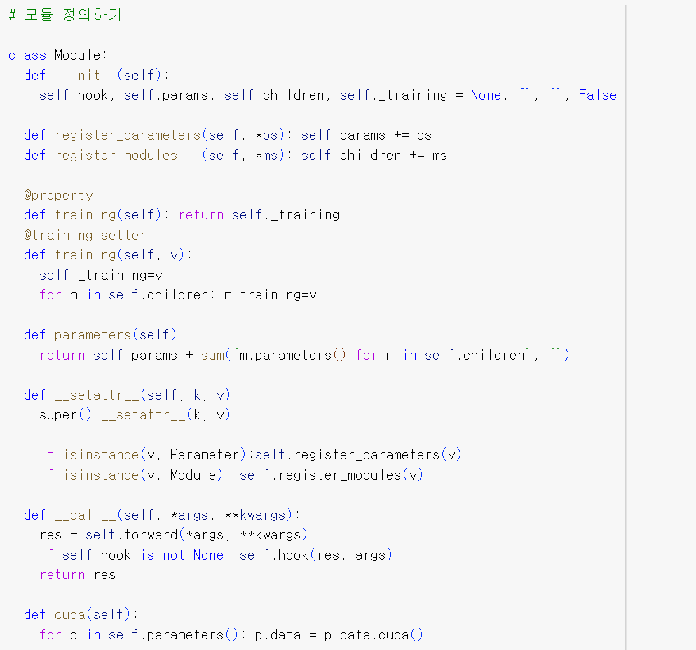 self.params + sum([m.parameters() for m in self.children], [ ]) 는 Module에 포함된 모든 파라미터를 반환함.