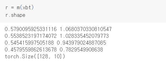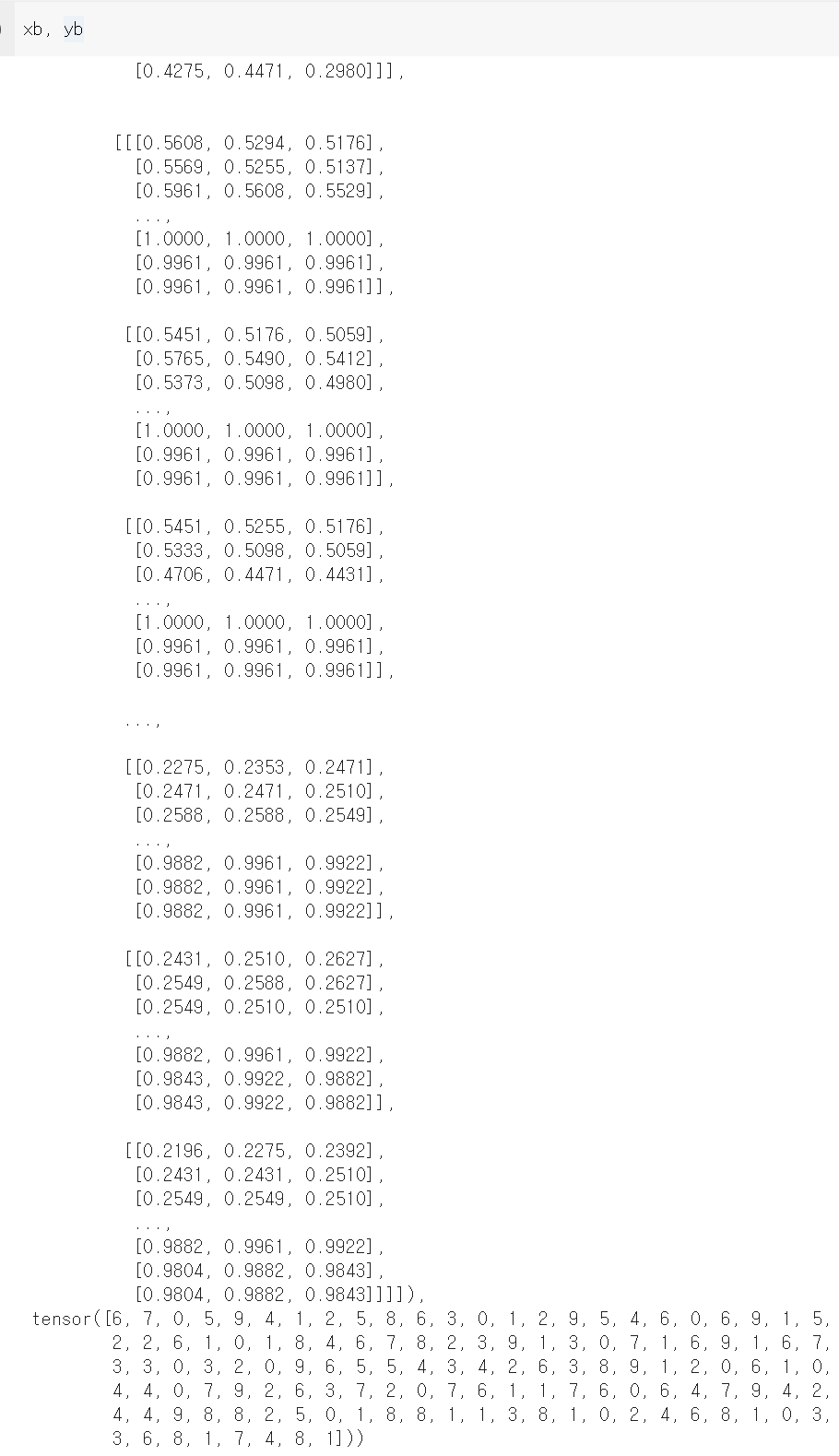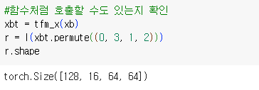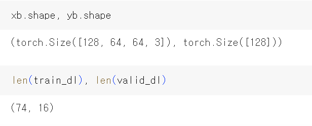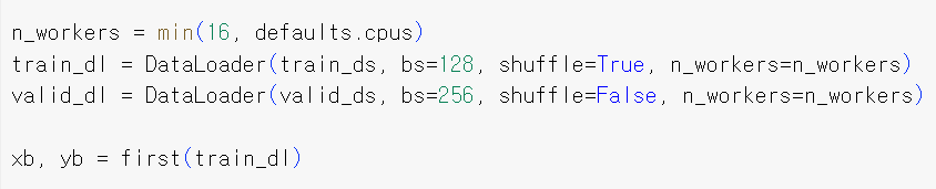 입력 텐서 xb에 변환(tfm_x) 적용. 데이터 전처리 또는 정규화를 함. xb는 train dataloader의 첫 번째 미니배치임( 그 중 이미지).