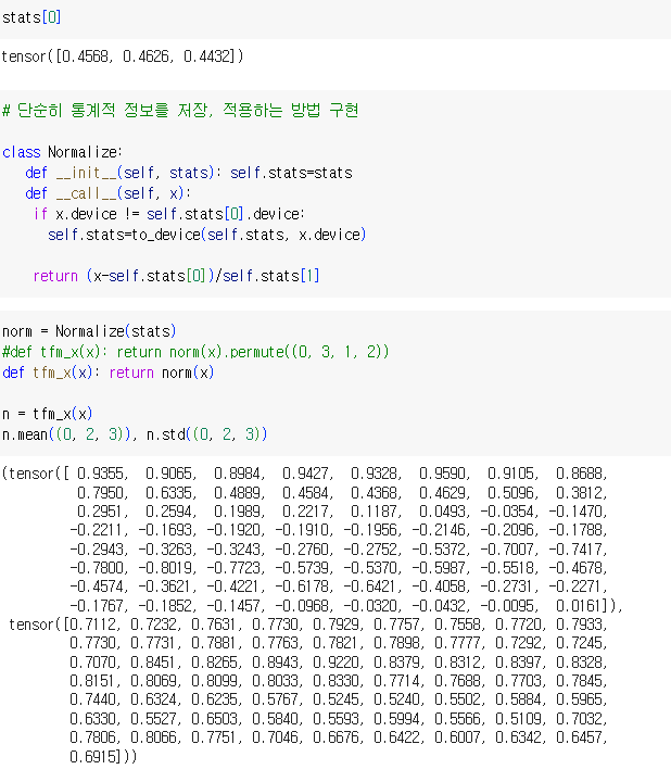 norm 객체를 Normalize 클래스를 적용하여 만듦. tfm_x 함수에서 norm 객체를 생성한 후 이미지 차원의 순서를 바꾸는 것.