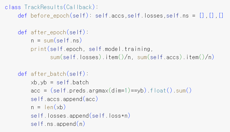 현재 epoch에 대한 정확도(self.accs), 손실(self.losses), 및 샘플 수(self.ns)를 저장할 빈 리스트를 초기화함