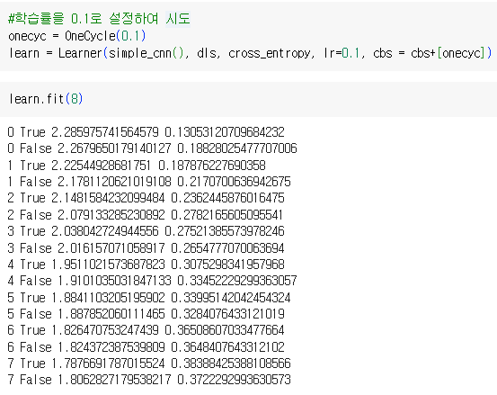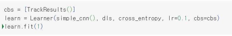 12. 위에서 만든 CNN, DataLoaders, 손실함수, 콜백함수, 학습률 등을 이용하여 Learner 사용하기(학습)