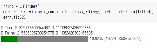 위에서 정의한 LRFinder 클래스를 이용하여 객체 생성. Learner에 적용하여 훈련함. lr=0.1이긴 하지만 LRFinder를 사용하므로 초기 학습률이 1e-6에서부터 시작하게 됨.