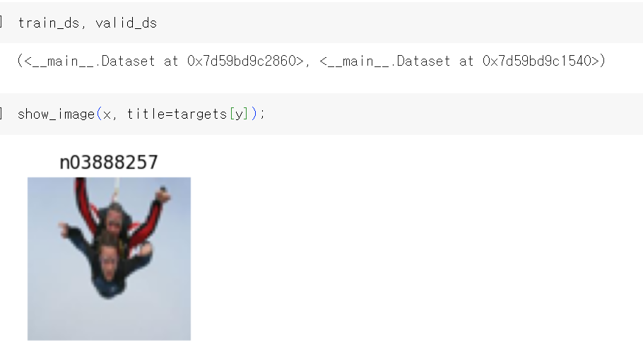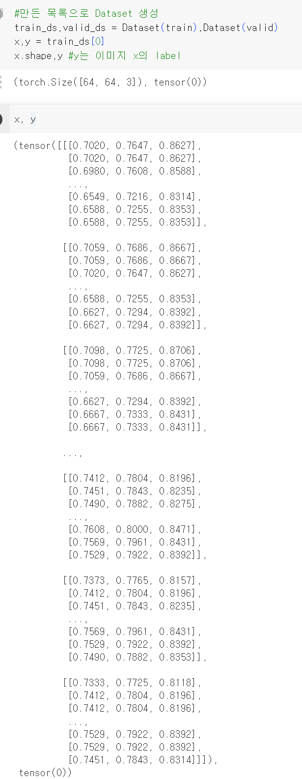 x, y = train_dls[0]은 그 중 첫 번째 객체이고, x는 0번째 이미지를, y는 0번째 이미지의 label을 할당받음.