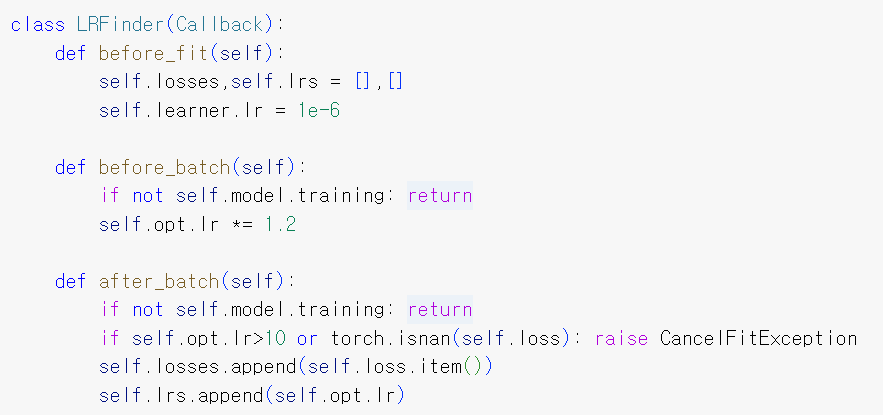 LRFinder 클래스는 Callback 클래스를 상속하며, 학습률 탐색을 위한 콜백 기능을 정의함