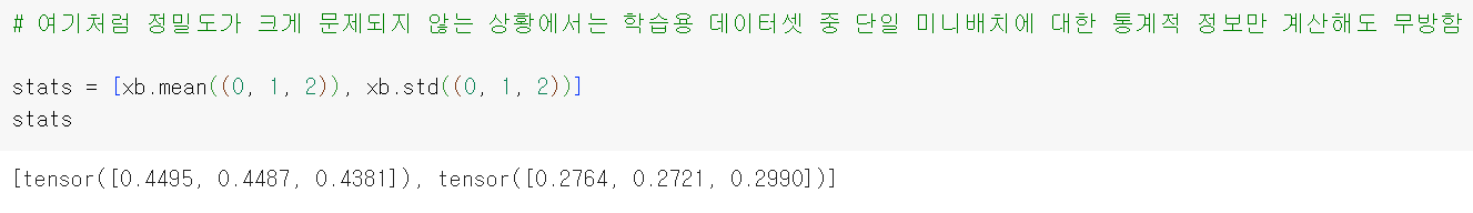 - xb.mean((0, 1, 2)): xb는 이미지 데이터를 담고 있는 텐서(batch)입니다. .mean((0, 1, 2))를 사용하여 이 텐서의 평균을 계산합니다. (0, 1, 2)는 평균을 계산할 차원을 지정하는데, 여기서는 0, 1, 2가 사용되어 이미지 데이터의 모든 차원(높이, 너비, 채널)에서 평균을 계산합니다. 결과로 나온 평균은 RGB 이미지의 각 채널별로 계산된 값입니다.