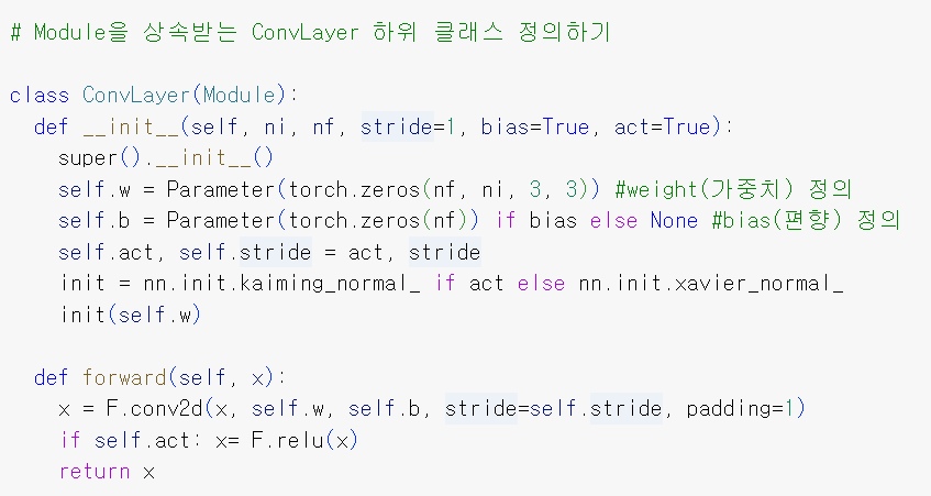 - act가 True인 경우 nn.init.kaining_normal_을 선택함. 이는 ReLU와 같은 활성화 함수와 함께 사용하기 위해 설계된 가중치 초기화 방법으로, ReLU 활성화를 사용할 때 vanishing gradient 또는 exploding gradient와 같은 문제를 방지하는 데 도움을 줌