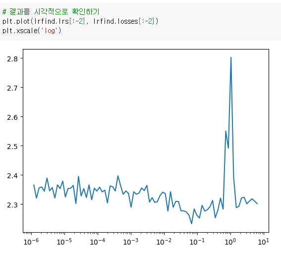 lrfind.losses는 각 학습률에서 얻은 손실값을 나타냄.