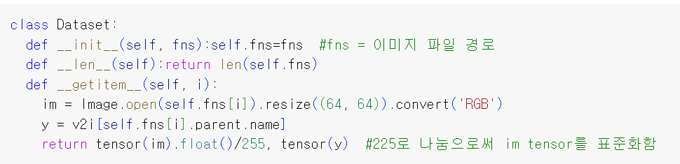 Dataset 클래스에 train dataset을 넣어서 train_dls를 만들면 2가지가 return됨. 표준화된 im 이미지와 label 명인 y.