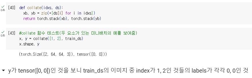 즉 idx를 사용하여 dataset을 shuffle한 뒤 batch 크기에 맞게 잘라서 chunks를 만들고, 이렇게 자른 chunks에 collate 함수를 사용하여 이미지는 이미지대로, label은 label대로 쌓아서 미니배치를 만드는 것.