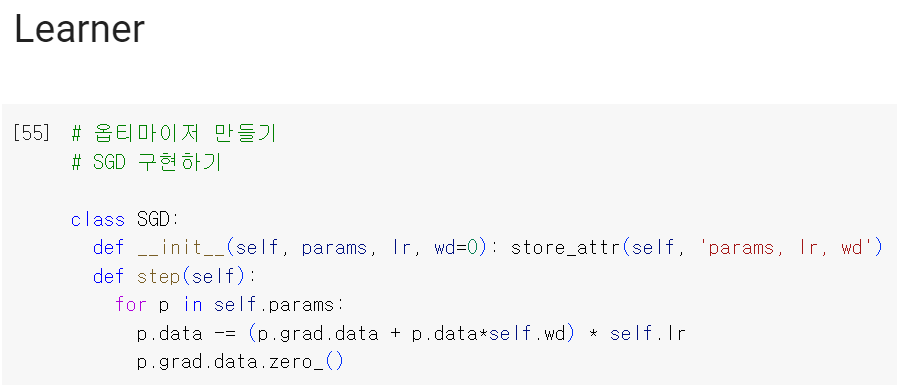 - p.data -= (p.grad.data + p.data*self.wd) * self.lr: 현재 파라미터의 데이터를 업데이트합니다. 이때, 경사(그래디언트)를 기반으로 하며, lr은 학습률, wd는 가중치 감소를 나타냅니다. 이러한 학습률과 가중치 감소를 사용하여 파라미터를 업데이트하면 모델이 손실을 줄이는 방향으로 이동합니다.