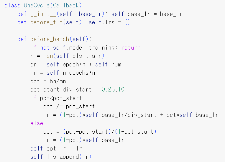 클래스의 생성자. base_lr은 기본 학습률로, 훈련 중에 사용될 최소 학습률을 의미함. 후에 Learner를 훈련시킬 때, lr=0.1로 정의함. 그러면 base_lr이 0.1이 되는 것. 즉 학습률은 초기값인 0.1에서 시작.