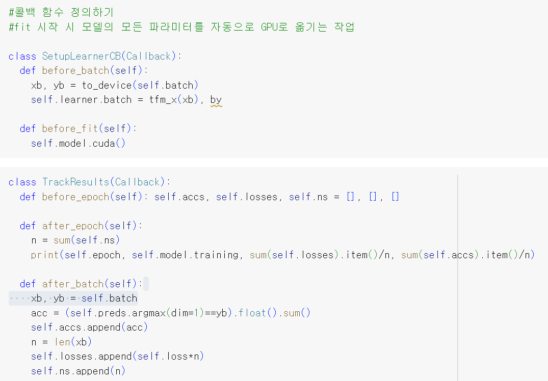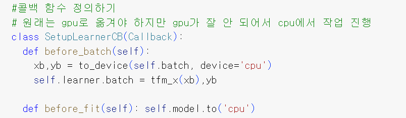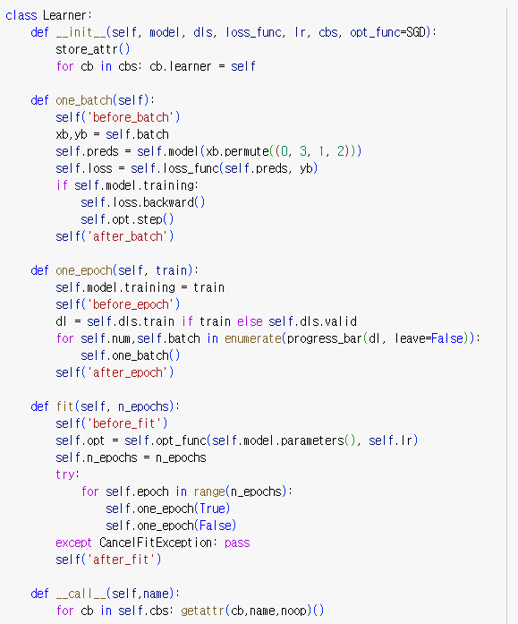 cb.learner는 Learner 클래스의 속성 중 하나. 콜백 객체(cb)가 현재 사용 중인 Learner 인스턴스를 참조하게 됨. 이를 통해 콜백은 학습 중에 모델, 데이터셋, 손실함수 등 다양한 학습 관련 객체에 접근하고 상호작용할 수 있음.