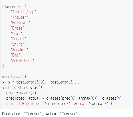 test 데이터의 결과값을 추론하기 전에 model.eval() 메소드를 호출하여 드롭아웃과 배치 정규화를 평가모드로 설정해야 함. 그렇지 않으면 일관성 없는 추론 결과가 생성됨.