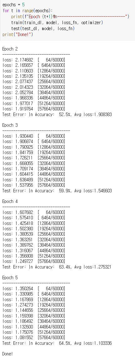학습 단계는 여러 번의 반복 단계(epoch)를 거쳐서 수행됨. 각 epoch에서 모델은 더 나은 예측을 하기 위해 매개변수를 학습함. 각 epoch마다 모델의 정확도(accuracy)와 손실(loss)을 출력함. epoch 마다 정확도가 증가하고 손실이 감소하는 것을 확인하려고 함.