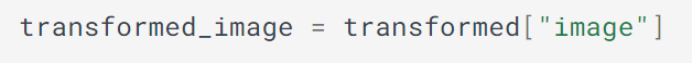 위의 transform 함수는 이미지라는 단일 키를 가진 딕셔너리를 반환함. 해당 키의 값은 증강된 이미지를 포함함