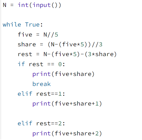 봉지수를 최소화하기 위해 전체 무게 N에서 5kg이 들어갈 수 있는 최대 수 구함(five)
