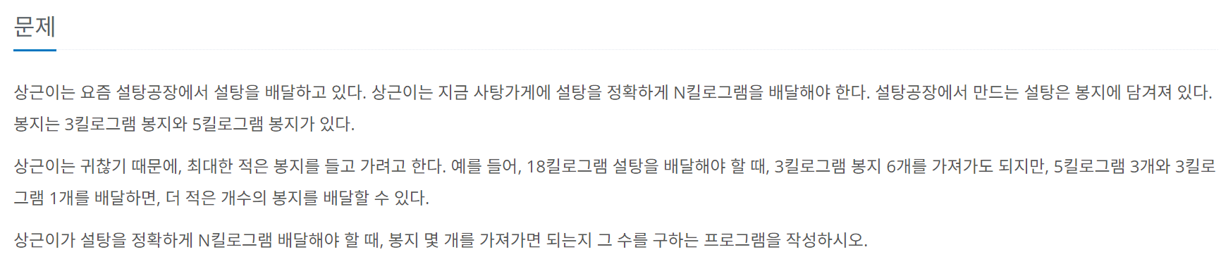 N이 3보다 작아서 아예 5로 나눗셈이 불가능한 경우, 3보다 크더라도 꽉 채우는 게 불가능한 경우(4kg, 7kg)을 고려하지 않아서 틀림. N이 1, 2, 4, 7 일 경우 5와 3으로 꽉 채우는 게 불가능하기 때문에 -1을 프린트해야 함. => 틀림