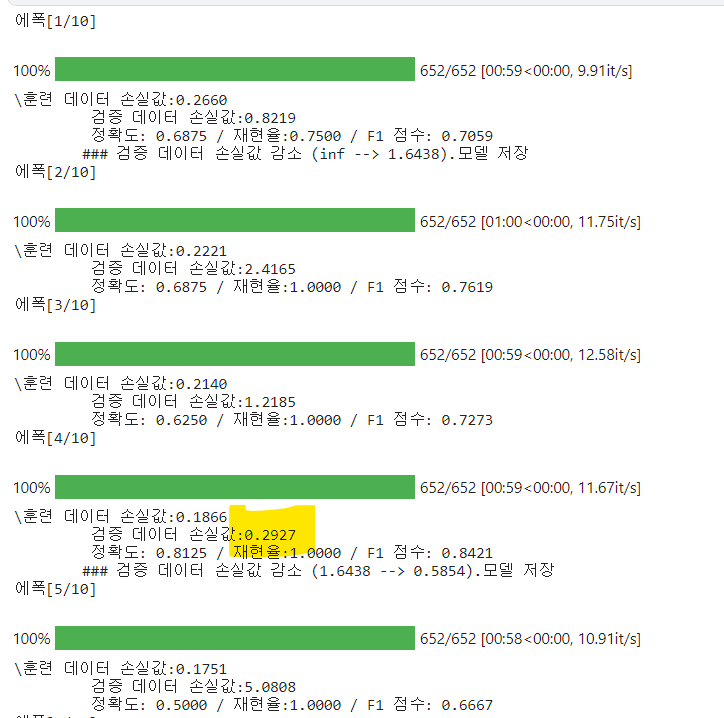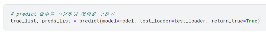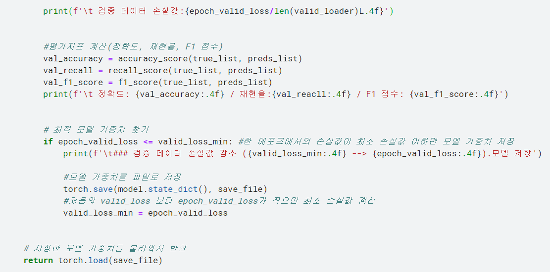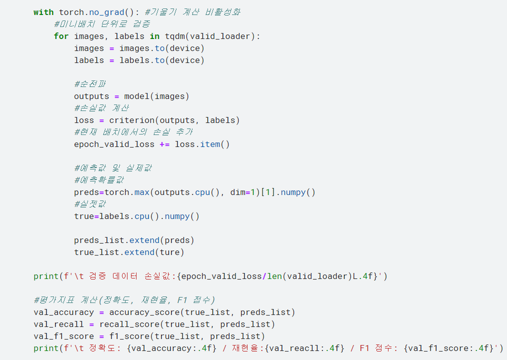 예측값 preds를 보면 torch.max는 최댓값을 구하는 메서드로, 예측 확률을 이산값으로 바꿔줌. 평가지표로 정확도, 재현율, F1 점수를 이용하려고 하므로 예측값을 확률이 아닌 이산값(0 또는 1)로 구해야 함.