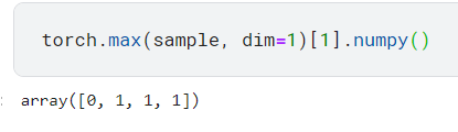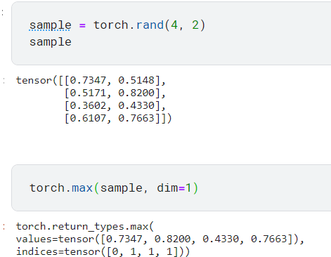 rand를 이용하여 랜덤값으로 4행 2열 tensor를 만듦. torch.max를 이용하여 각 행마다의 최댓값을 구함.