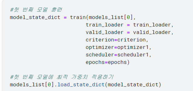 epochs 수만큼 훈련과 검증을 반복하면서 최적 모델 가중치를 찾아서 마지막으로 반환하는 구조의 훈련 함수 작성.