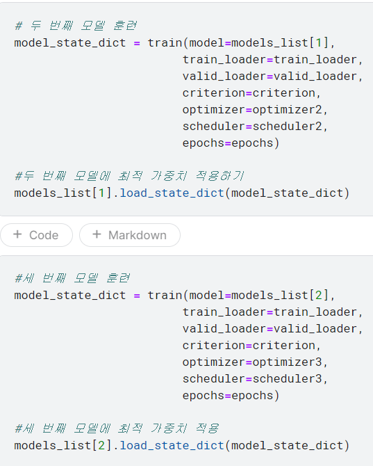 *모델 훈련 및 성능 검증: 위에서 정의했던 train 함수를 이용하여 세 개 모델을 순차적으로 훈련시키기