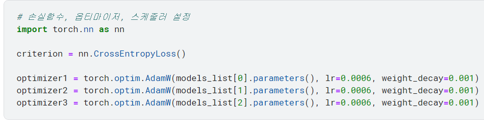 베이스라인에서 사용한 Adam에 가중치 감쇠를 추가한 AdamW 옵티마이저를 이용함