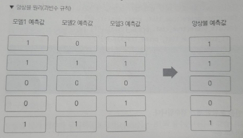 * 앙상블의 원리: 세 예측값을 모두 합친 뒤 3으로 나누고, np.round 함수로 반올림함. 이렇게 하면 과반수가 예측한 값을 최종 예측값으로 결정하게 됨