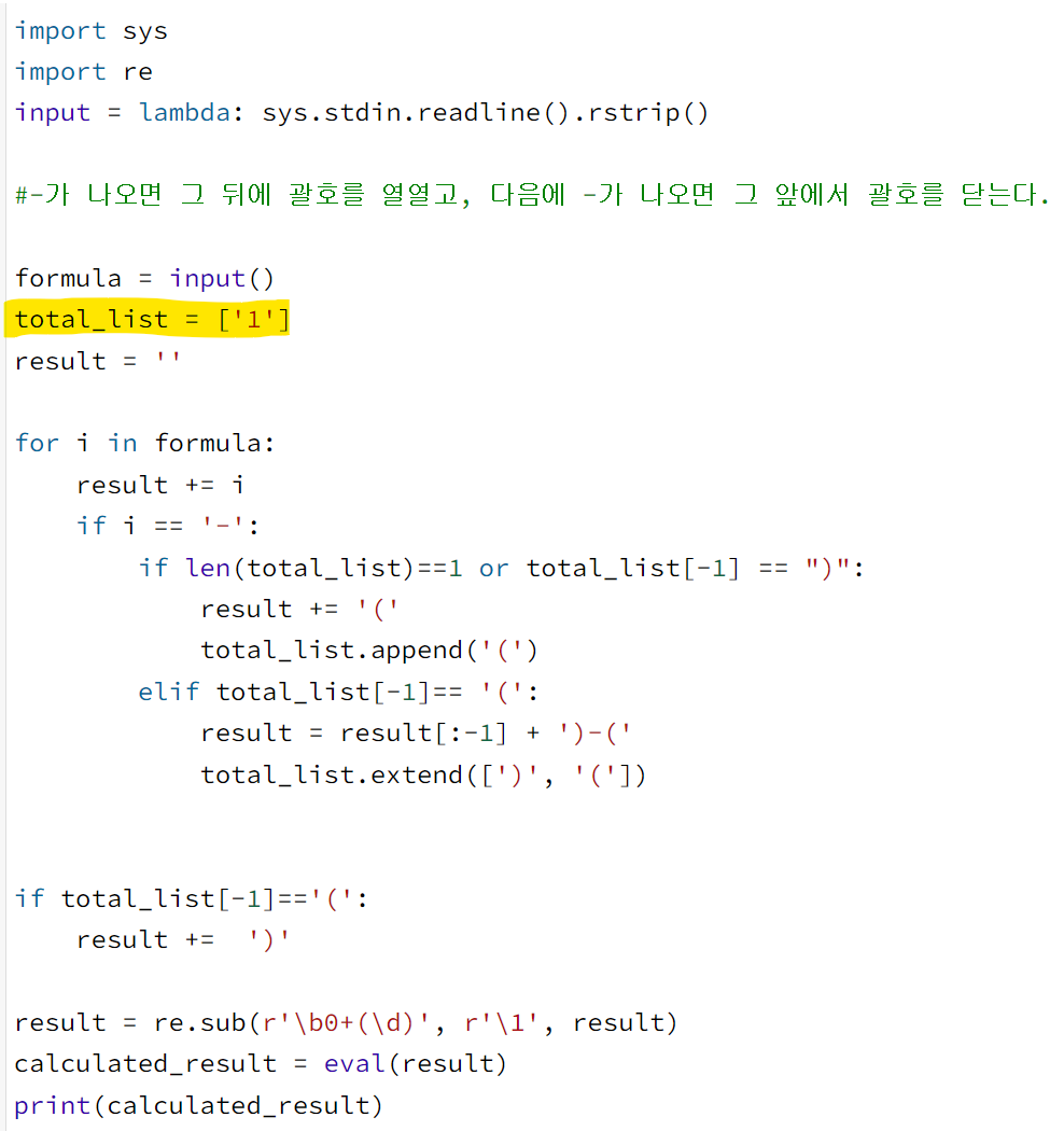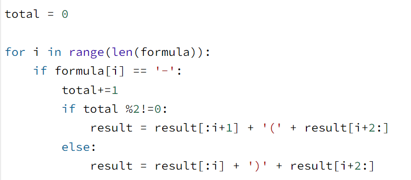 input을 formula로 정의한 후, formula를 for문으로 돌면서 문자를 하나씩 result에 넣는다. 그러다가 '-' 기호 차례가 되면 total_list에 들어있는 마지막 괄호가 무엇인지 파악하여 그 다음의 괄호를 result에 넣고, total_list에도 추가한다.