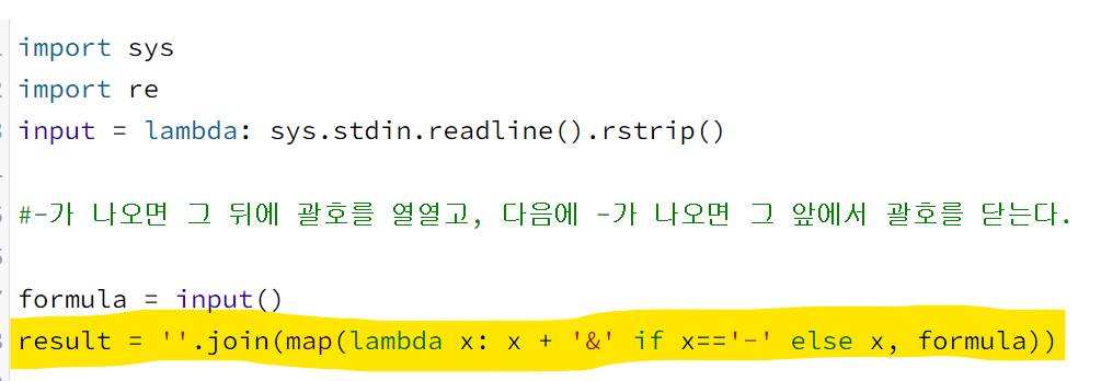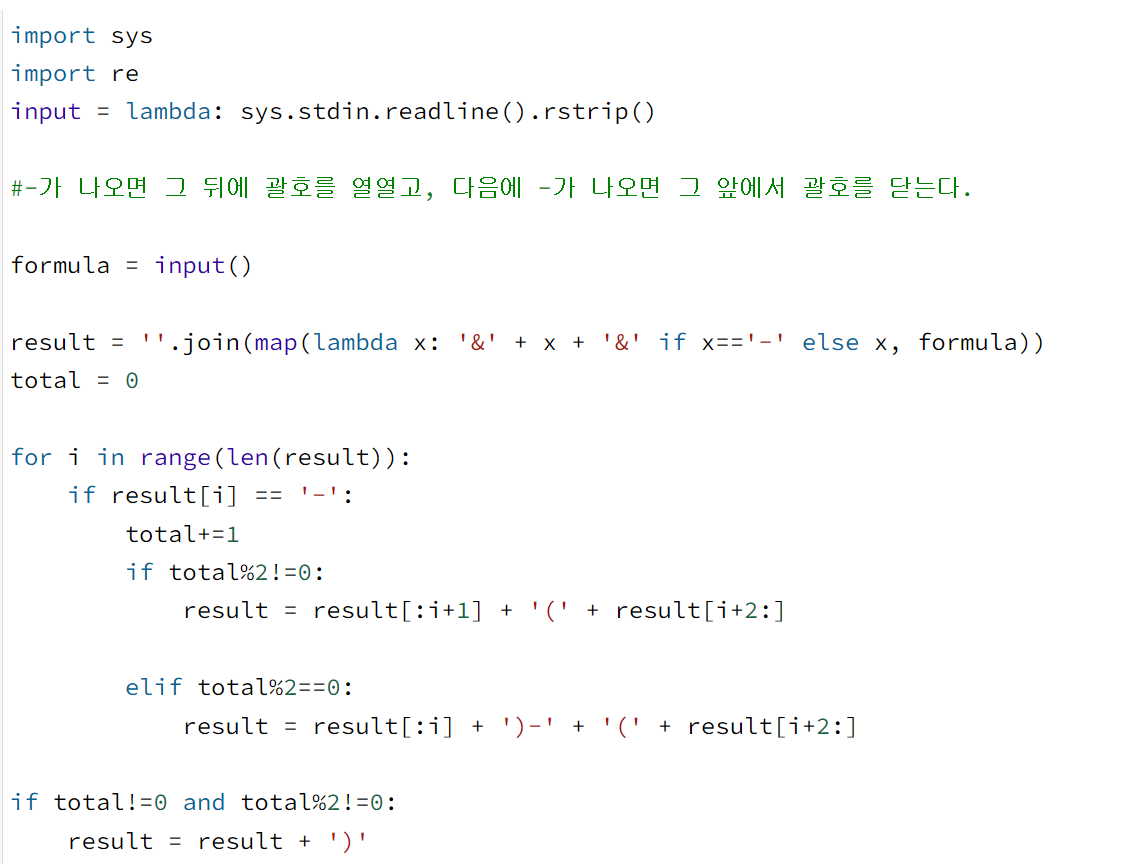 for문을 돌기 시작해서 '-' 기호를 만나면 괄호를 추가할 것이기 때문에 total에 1을 더하고, 여는 괄호와 닫는 괄호 중 무엇을 넣어야 하는지 total을 이용하여 판단하였다. total에 이미 1을 더했기 때문에, 이는 새로운 괄호가 나와야 한다는 것을 의미한다. 따라서 total이 짝수가 아니면 &를 여는 괄호로 바꾸고, total이 홀수면 &를 닫는 괄호로 바꿨다.