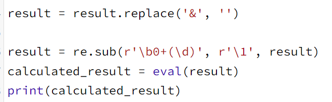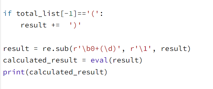 그리고 정규식과 eval을 사용하여 result를 계산하였다. eval을 사용하면 문자열인 수학식을 계산할 수 있다.