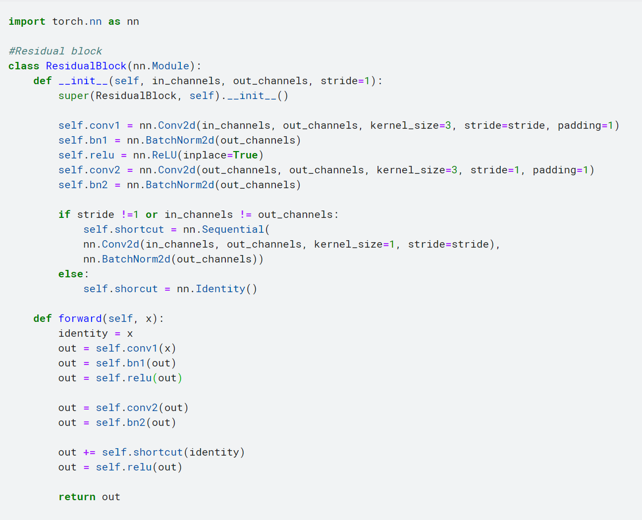 - 스트라이드가 1이 아니거나 입력 채널의 수가 출력 채널의 수와 다른 경우, 잔차 연결을 위한 shortcut 연결이 생성됨. 이 shortcut 연결은 입력과 출력 특성 맵의 차원을 맞추기 위해 합성곱 레이어 (nn.Conv2d)와 배치 정규화 (nn.BatchNorm2d)를 사용하여 구현함
