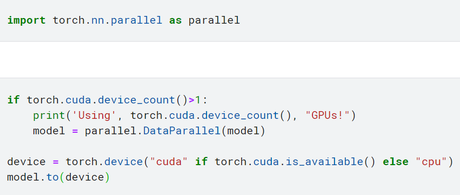 - if 문 내에서 print('Using', torch.cuda.device_count(), "GPUs!")는 사용 가능한 GPU의 개수를 출력합니다.
