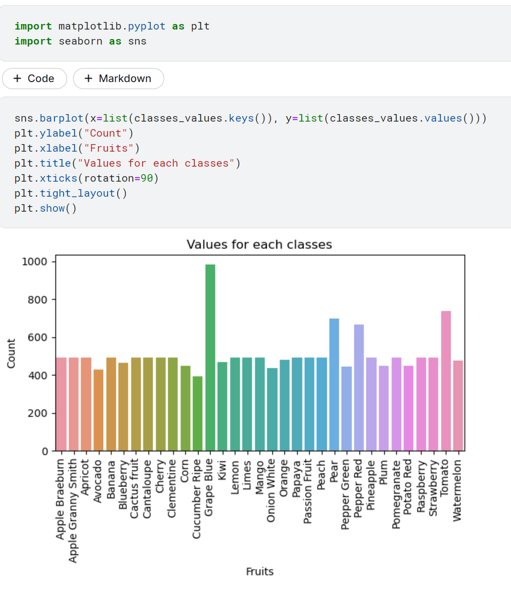 데이터셋에서 클래스 정보를 추출하여 classes 변수에 저장함. train_data1은 이미지 데이터셋 객체를 나타내며, 클래스 정보는 해당 데이터셋의 클래스 레이블로부터 추출함. 과일들의 클래스 개수는 33개