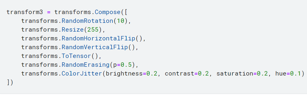 - transforms.ColorJitter(brightness=0.2, contrast=0.2, saturation=0.2, hue=0.1): 이미지의 색상을 무작위로 변화시키는 변환. 밝기, 대비, 채도, 색조에 무작위한 변화를 가해 데이터에 다양성을 추가함
