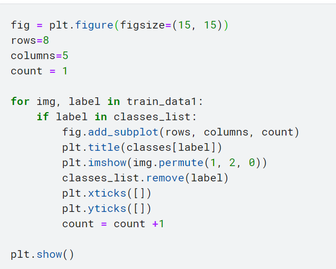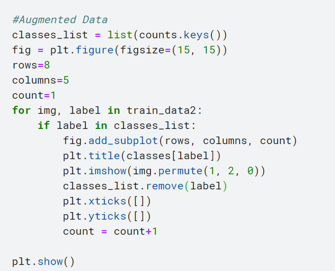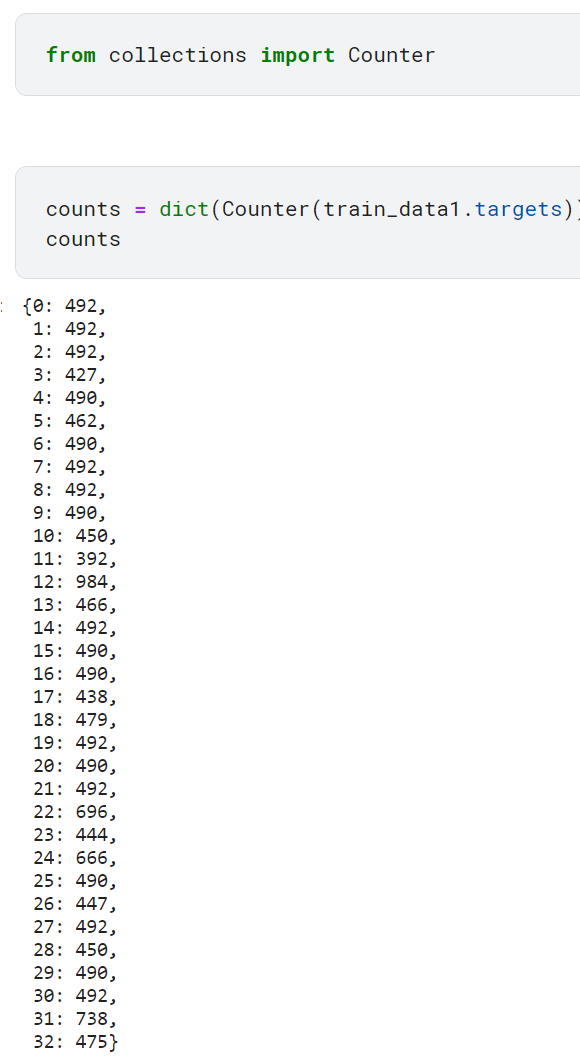 - counts = dict(Counter(train_data1.targets)): Counter 클래스를 사용하여 train_data1 데이터셋의 클래스 레이블(targets)에서 각 클래스의 데이터 개수를 계산함. Counter 객체의 결과를 dict() 함수를 사용하여 딕셔너리로 변환한 후, counts 변수에 저장함.