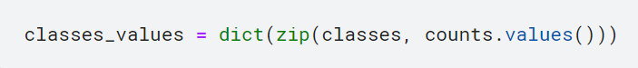 counts 딕셔너리의 값(value) 부분을 반환하는 코드. counts 딕셔너리는 각 클래스의 데이터 개수를 클래스 레이블을 키(key)로 가지고 있음. counts.values()를 사용하면 이러한 데이터 개수 값들을 리스트 형태로 얻을 수 있음