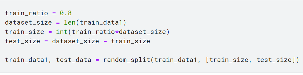 - train_data1, test_data = random_split(train_data1, [train_size, test_size]): random_split() 함수를 사용하여 train_data1 데이터셋을 훈련 세트와 테스트 세트로 분할합니다. 첫 번째 인자로는 분할할 데이터셋을 전달하고, 두 번째 인자로는 [train_size, test_size] 리스트를 전달하여 훈련 세트와 테스트 세트의 크기를 지정합니다. 이 함수는 데이터셋을 무작위로 분할하여 지정된 크기에 맞게 나누고, 두 개의 데이터셋을 반환합니다. 이를 train_data1과 test_data 변수에 할당합니다.