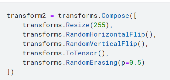 - transforms.RandomErasing(p=0.5): 이미지에서 무작위로 사각형 영역을 선택하여 삭제하는 변환. 데이터 증강을 위한 기법으로 사용됨.