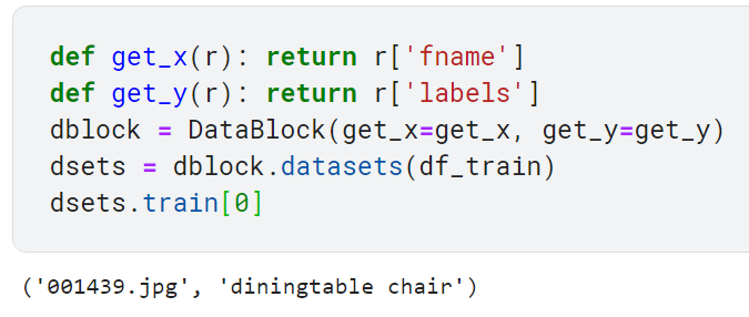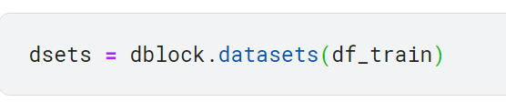 정리하면, dblock에서 정의한 규칙을 기반으로 df_train 데이터프레임을 사용하여 datasets 메서드를 호출하면 훈련 및 검증 데이터셋이 포함된 데이터셋 객체를 얻을 수 있음.