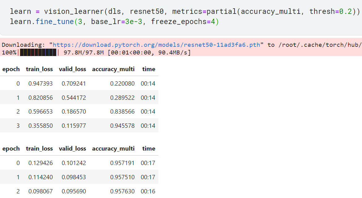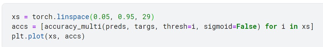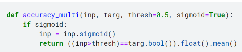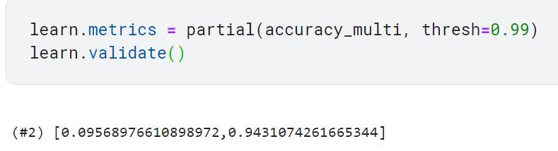 이제 평가지표 함수에 예측값과 타깃값을 넣어서 성능을 평가할 수 있음. 다만 get_preds 메서드가 이미 기본적으로 출력 활성화 함수(여기서는 시그모이드)를 적용했으므로, accuracy_multi에서 sigmoid를 중복해서 적용하지 않도록 조치해야 함.