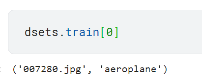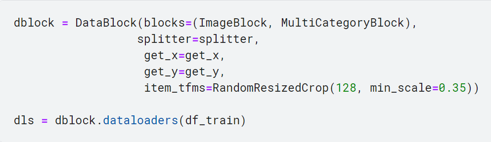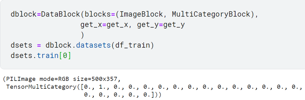 - DataBlock 객체로 Datasets 객체 생성하기(이때 실제 데이터 소스를 명시해야 함. 여기서는 앞에서 정의한 df_train csv 파일을 적용함)
