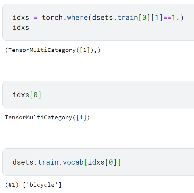 앞서 출력된 원-핫 인코딩 형식의 벡터가 어떤 범주를 표현하는지 확인하기. 모든 색인을 찾아주는 편리한 torch.where 함수를 사용함.