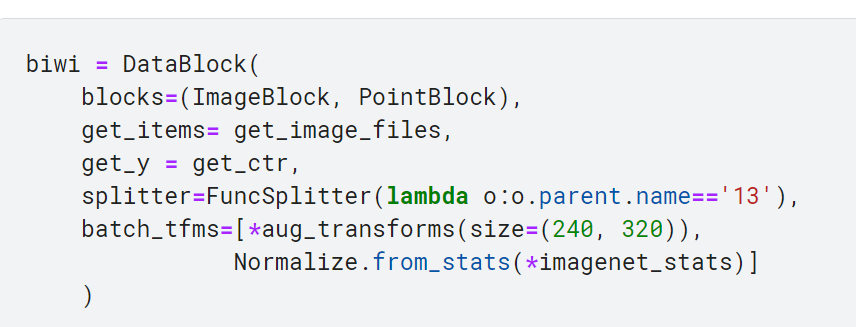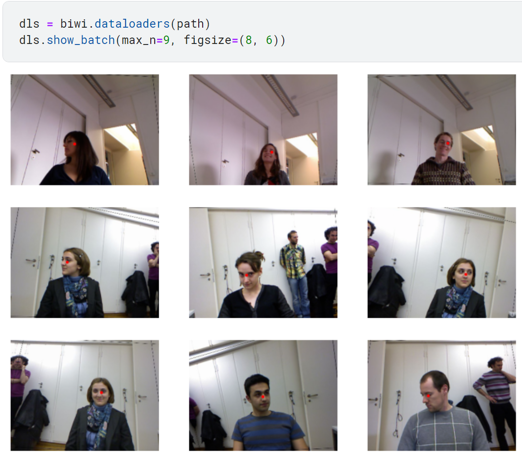 blocks에서 두 번째 block으로 PointBlock을 사용하면 fastai가 레이블이 좌표로 표현된다는 사실을 파악함. 또한 데이터 증강을 적용하는 순간에 이미지 뿐만 아니라 좌표에도 같은 증강 기법을 적용해야 한다는 점도 파악함.