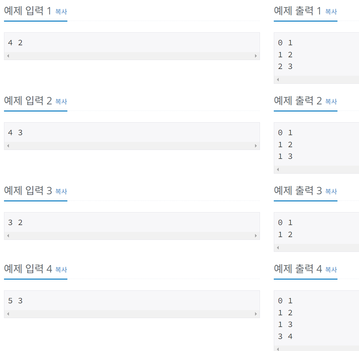 예를 들어 예제가 4 2 일 때 예제 출력이 0 1, 1 2, 2 3이다.