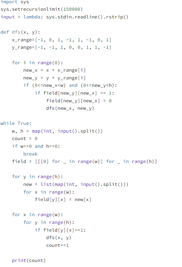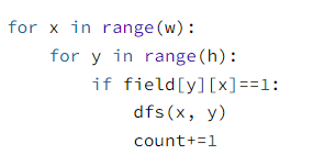 field를 채우고 나면 땅은 1, 바다는 0이다. 이제 field의 모든 칸을 돌면서 해당 칸이 1인 경우에 깊이우선탐색을 실시하여 인접한 1인 칸들을 모두 알아내면 된다. 이중 for문을 써서 field의 모든 칸을 탐색하되, 해당 칸이 1이면 우선탐색을 실시해서 인접한 칸들까지 탐색하도록 했다. 인접한 칸들을 자식 노드처럼 생각하고 탐색하는 것이다. 해당 칸에 대한 깊이우선탐색이 끝나면 count에 1을 더한다. 깊이우선탐색이 종료되었다는 것은 그 칸과 인접한 칸, 모든 자식 노드들에 대한 탐색이 끝났다는 것을 의미한다.