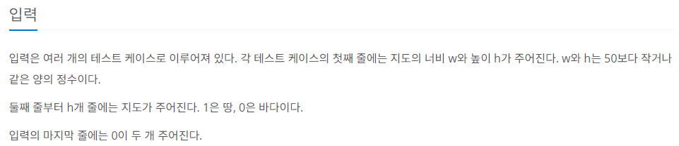 while문은 주어진 수를 이용하여 field를 만들기 위해 사용했다. 이 문제에서는 테스트 케이스가 몇 개인지를 알려주지 않고, 입력의 마지막 줄에 0이 두 개 주어지면 끝을 내야 한다. 따라서 w, h로 지도의 너비와 높이를 구하되, 둘 다 0이면 while문을 종료하도록 했다. count는 섬의 수를 의미한다. field는 지도 전체에 우선 0을 넣어서 구성한다.